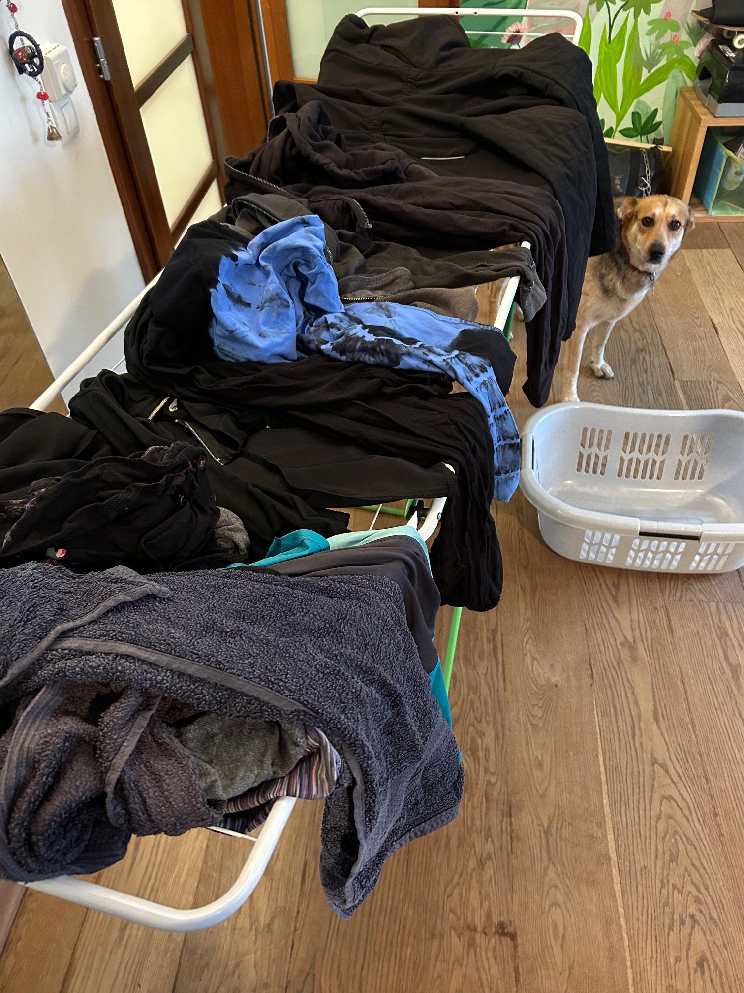 By then I’ve reached the rack — and I see, amazed, that he’s dumped all the clothes, just as I took them out of the washing machine, wrinkled, in one heap, right onto the rack. And done. Why didn’t I think of this before!